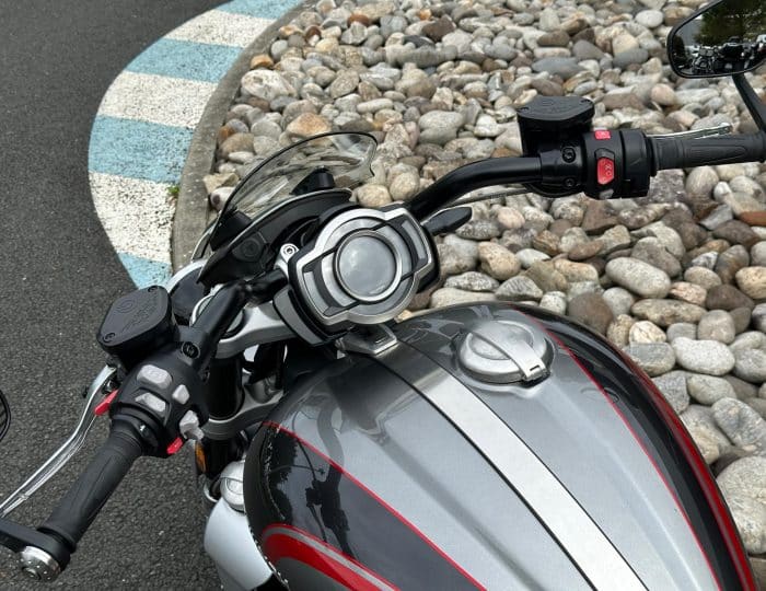 Moto posée à l’arrêt, quelques rayures côté droit : embout de silencieux frotté, Rétroviseur frotté et protection de frein griffé